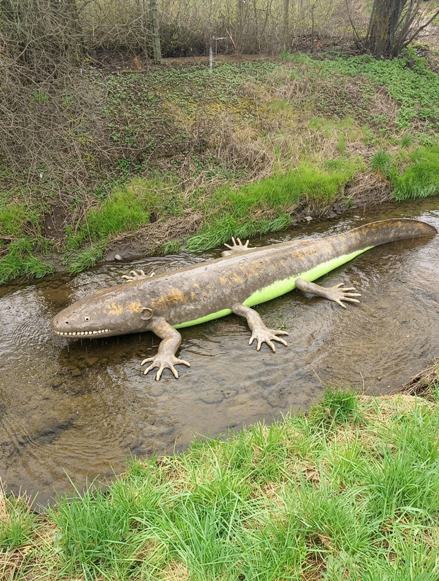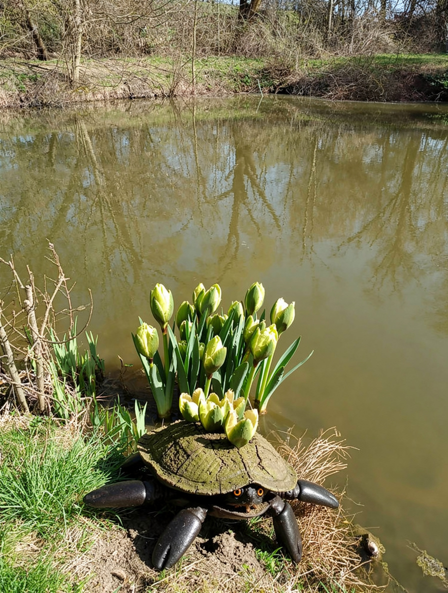 Rarity: Uncommon. The TĹŻĹĂĄk is a semi-aquatic crustacean-like cryptid endemic to the slow, murky ponds and oxbow pools of the Moravian lowlands, particularly concentrated in the VyĹĄkov district. Adults measure 35â50 cm in body length, with a broad, flattened carapace resembling waterlogged bark â mottled olive-brown with patches of bright chartreuse that mimic emerging spring vegetation. Six articulated limbs end in paddle-shaped appendages fringed with fine setae, used for both locomotion across soft mud and slow sculling through turbid water. Its most distinctive feature is a crown of 8â12 fleshy, leaf-shaped dorsal projections along the carapace ridge, which in early spring unfurl and stand erect, perfectly imitating the shoots of yellow flag iris (Iris pseudacorus). This remarkable mimicry allows the creature to bask at the water's edge in plain sight, indistinguishable from the emerging plant growth around it. The TĹŻĹĂĄk feeds on detritus, aquatic invertebrates, and the rhizomes of pond-edge plants, using specialized chelicerae hidden beneath a ventral flap. When disturbed, it rapidly submerges, expelling a cloud of fine silt from specialized gill chambers â a behavior locals describe as the pond "breathing." Its olive-tinted hemolymph contains high concentrations of biliverdin analogues, giving its tissues a greenish hue that contributes to its camouflage. Moravian folklore holds that ponds harboring TĹŻĹĂĄky never fully freeze in winter, as the creatures generate metabolic heat through a unique anaerobic fermentation process in their hepatopancreas, raising the surrounding water temperature by 1â2°C. Weaknesses include sensitivity to water clarity â in clear streams, their camouflage fails entirely, restricting them to turbid, nutrient-rich waters. They are also slow on land, making them vulnerable during the brief spring dispersal period when they migrate between ponds. The species is solitary and territorial, with individuals defending a 5â10 meter stretch of shoreline. Breeding occurs in late March, with females depositing gelatinous egg masses among real iris rhizomes, further blurring the line between organism and plant.