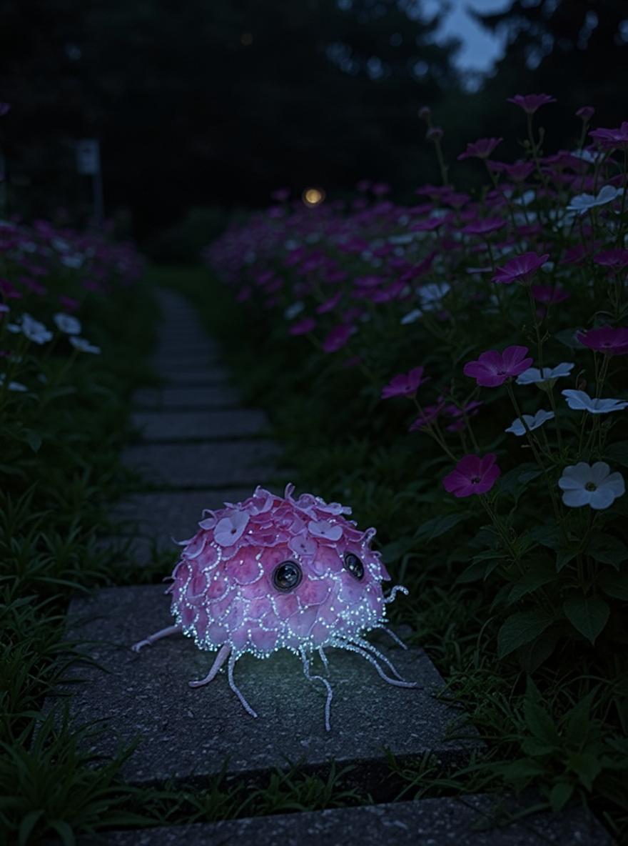 The Květuch is an exceedingly rare garden cryptid native to the rural-urban fringes of South Moravia. Adult Květuchs grow to about 30 cm in length, resembling a blend of small mammal and flower patch. Their key adaptation is a mantle of living, petal-like skin structures that can rapidly change color, shape, and even scent to mimic local flowers with uncanny precision. During dusk, Květuchs emit a soft, shifting bioluminescence from specialized organs beneath their 'petals,' creating a subtle shimmering effect that is hypnotic to insects and small animals. They are most active at twilight, feeding on attracted prey and sipping nectar. Květuchs burrow shallow dens under garden paths or among rocks, using their camouflage both for protection and hunting. Their presence is said to promote healthy plant growth, likely due to symbiotic bacteria in their skin that enhance soil fertility. Weaknesses include vulnerability to cold and rapid environmental change. Their existence is supported by a plausible evolutionary path: convergent evolution between animal mimicry and plant symbiosis, with their unique flower-mimicking tissues derived from highly modified integumentary structures. Květuchs are silent, solitary, and nearly impossible to detect unless you catch the faint glimmer of their dusk-time glow.