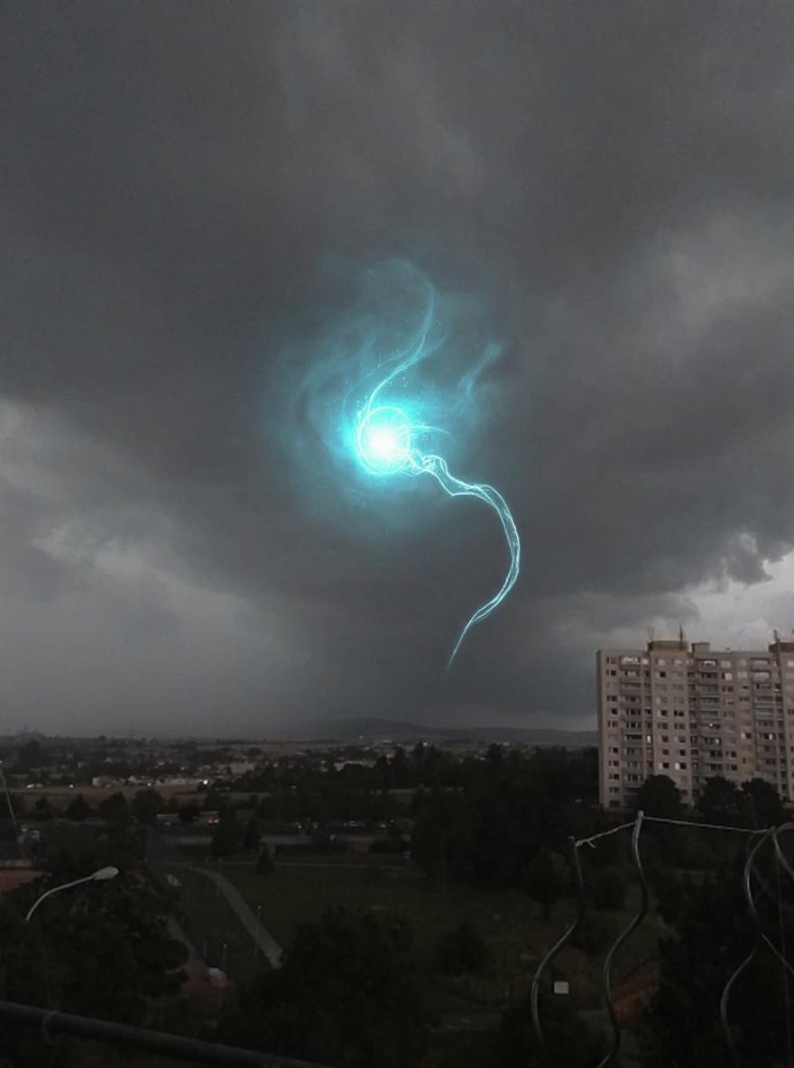 Bouřňák Záře, or the 'Radiant Stormwisp,' is an extraordinarily rare cryptid believed to manifest only during intense thunderstorms over urban parks and high-rises in South Moravia. Its body is composed of magnetic, semi-transparent vapor that can phase through solid objects, allowing it to drift between trees and buildings with ease. Thin, glowing tendrils extend from its core, crackling with soft blue-white bioluminescence, which intensifies when it manipulates atmospheric electricity to create brief, localized lightning. Its vaporous anatomy enables it to absorb and redirect rainwater, using sudden humidity shifts to camouflage or vanish entirely. Local legends claim that sightings of Bouřňák Záře precede unusual weather phenomena, such as rain falling upward or silent thunder. Evolutionarily, this cryptid likely developed its unique traits to survive in urban microclimates, using electromagnetic pulses both for communication and defense. Its main weakness is sunlight, which rapidly dissipates its vaporous form. Bouřňák Záře is non-aggressive, feeding on charged particles and atmospheric ions.