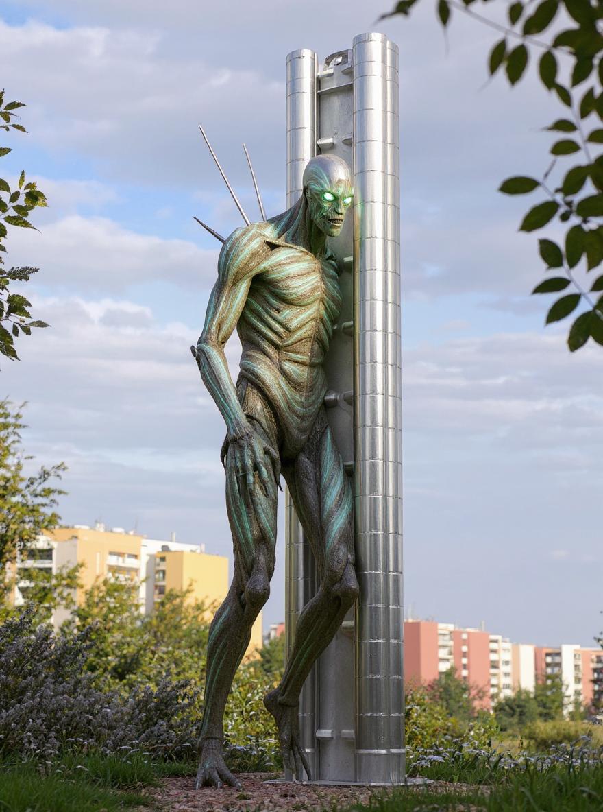 Železný Přelud is an extremely rare cryptid reputed to haunt transitional zones between dense urban environments and green spaces in Central Europe, particularly in Brno. The Iron Phantom exhibits two traits unknown in real animals: its body is composed of both organic, plant-like tissue and articulated, metallic plates that shift and blend seamlessly, allowing it to cling to or mimic man-made structures like metal towers. Its second unique trait is its ability to emit bioluminescent patterns that change color to match nearby apartment facades, making it nearly invisible to casual observers. Adults measure up to 2.5 meters tall when upright, with elongated limbs ending in fine, root-like tendrils capable of gripping both bark and steel. Its diet is thought to consist of electrical energy and trace metals, which it absorbs through specialized dermal plates. It is most active at dusk, when its bioluminescence is visible in brief flashes. Locals report seeing it only from the corner of their eye, especially near metallic structures after rainfall, which may help recharge its energy stores. Evolutionary theories suggest it arose from a symbiotic relationship between an unknown plant-animal hybrid and industrial debris, allowing it to thrive in urbanized but green-rich environments. Its main weakness is exposure to strong magnetic fields, which can disrupt its camouflage and movement.