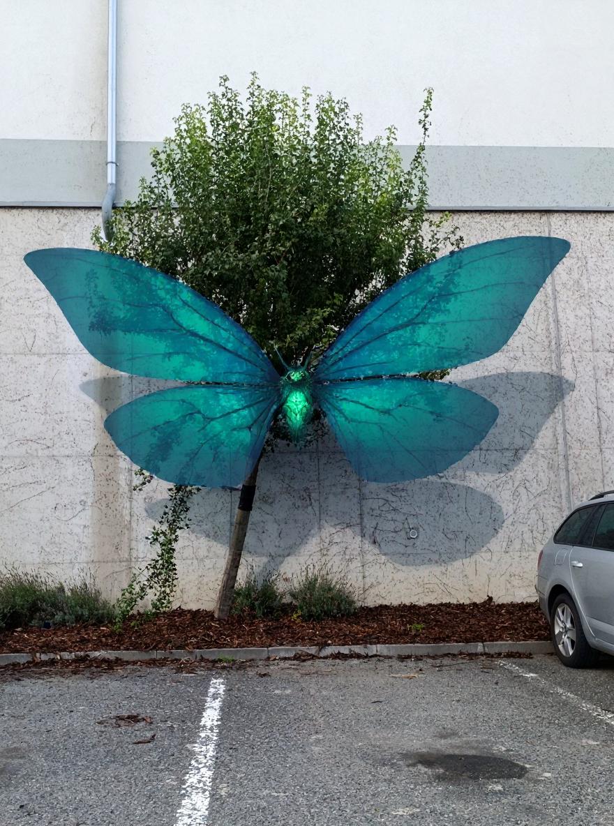 The Stínový Stromokřídl is a legendary cryptid said to inhabit the urban green spaces of Brno. Resembling a seamless fusion of tree and animal, this elusive being uses adaptive mimicry to blend with city trees. Its body is a semi-translucent, chlorophyll-infused membrane that wraps around tree trunks and branches, forming wing-like extensions that flutter in the evening breeze. When undisturbed, it is nearly invisible, but at dusk, its wings shimmer with iridescent patterns—bioluminescent veins pulse softly, mimicking the dappled light under trees. The Stromokřídl is believed to feed on ambient sound vibrations and atmospheric particulates, filtering city air through specialized stomata on its wings. It can detach and glide silently between trees, using its plant-animal hybrid physiology to root temporarily or take flight. Local legend claims it protects urban flora from disease and absorbs pollution. Its rarity is legendary, with only fleeting glimpses reported. Its strengths are perfect camouflage, environmental adaptation, and bioluminescence; its weakness is bright direct light, which disrupts its mimicry and forces it to retreat. Its hybrid biology is explained by a rare symbiotic gene transfer event between local trees and an unknown airborne organism during a 19th-century meteor shower, resulting in this remarkable entity.