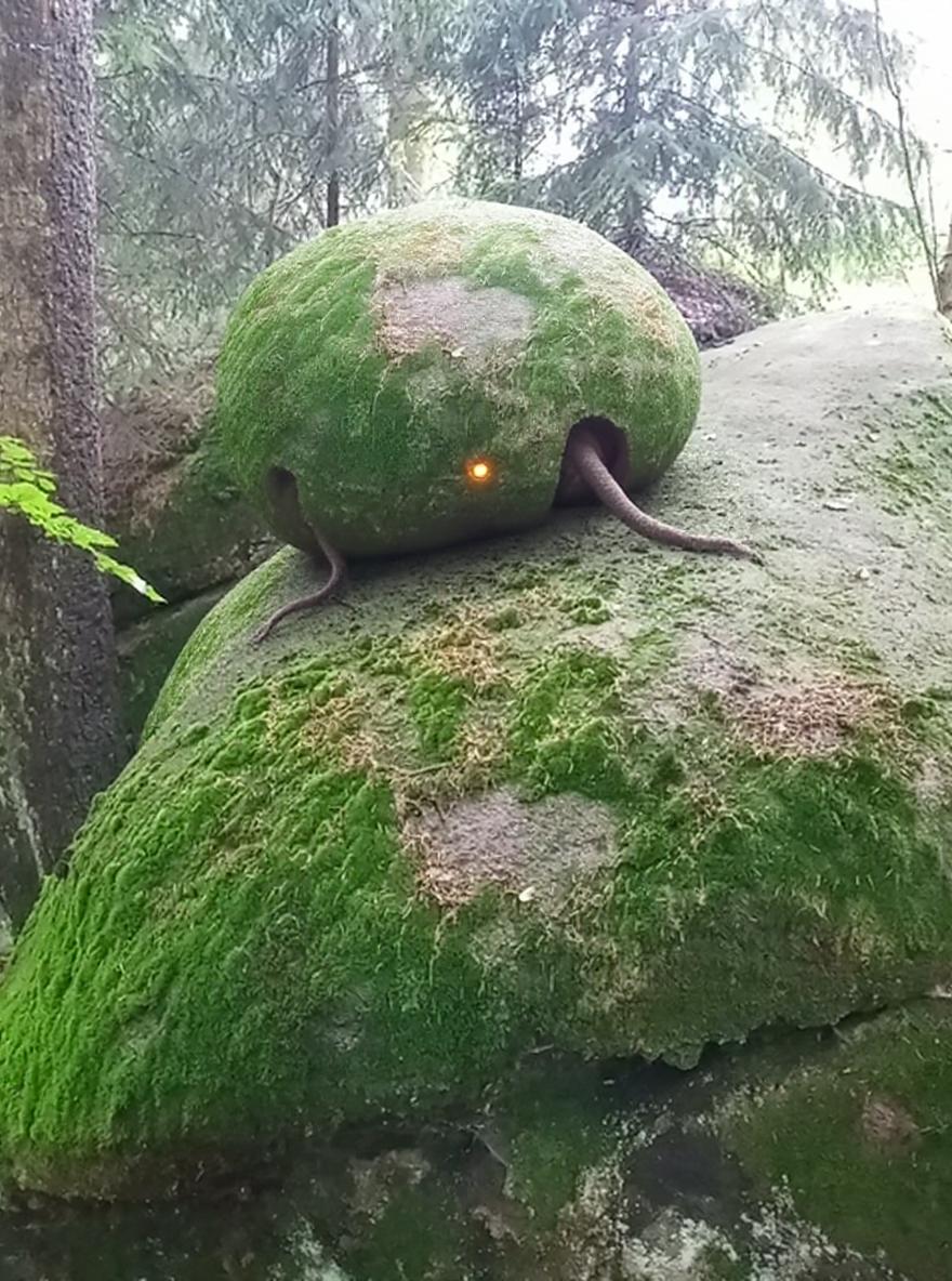 The Mechový Škrtič (Moss Strangler) is an uncommon cryptid found in the mossy forests and boulder fields of Northern Bohemia. It measures up to 1.2 meters long, resembling a cross between a boulder and a cephalopod, with a body covered in thick, living moss and lichen that seamlessly blends with its habitat. Its upper surface mimics the texture and coloration of local stones, while the underside conceals retractable, root-like tendrils. The Škrtič is semi-sessile, remaining motionless for hours or days, but when prey (usually small mammals or large insects) passes by, it animates, ensnaring them with rapid, constricting tendrils. It absorbs nutrients through specialized pores on its underside and can photosynthesize via symbiotic moss. Its camouflage is near-perfect, and it remains dormant for weeks, making sightings rare but not impossible. Locals believe it is a forest guardian, punishing those who disrespect the woods. Evolutionarily, the Škrtič likely developed its mimicry and symbiosis to outcompete other detritivores and avoid predation, explaining its unexplainable immobility and blending abilities through advanced chromatophores and fungal-moss symbiosis.