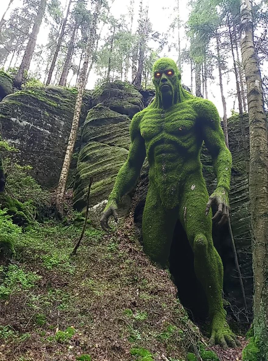 Mechový Strážce is a legendary, awe-inspiring cryptid known only from rare sightings deep in the sandstone forests of Královéhradecký kraj. This creature stands between 2.5 and 3 meters tall, its body perfectly mimicking the appearance and texture of mossy stone through biochromatic skin and a crust of living symbiotic mosses and lichens. Its limbs are elongated and segmented, resembling twisted roots and eroded stone, while its back is covered in layered, striated plates that echo the local sandstone’s unique patterns. The cryptid is semi-sessile, able to anchor itself motionless for decades, absorbing nutrients from the rock and air through specialized hyphal filaments. At dusk or when disturbed, it can slowly detach and move with a grinding, echoing stride. Its sensory organs are embedded in deep eye sockets concealed by mossy tufts, allowing it to perceive vibrations and chemical cues. Mechový Strážce is said to be a silent guardian, emerging to protect the forest only when ancient stones are threatened. Its rarity is legendary—folk tales claim only those pure of heart or lost in the mist ever glimpse it. Its existence is scientifically explained by a unique convergent evolution between animal and fungal kingdoms, granting it unparalleled camouflage and resilience. Weaknesses: extremely slow movement and vulnerability to drought.