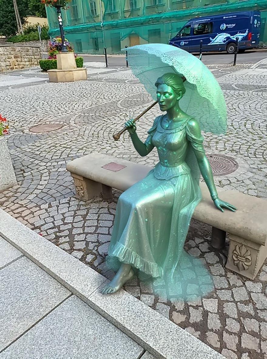 The Kamienna Czuwaczka ('The Stone Watcher Lady') is an epic rarity cryptid believed to inhabit historic plazas and spa towns of Lower Silesia. Resembling elegant, ornamental statues, it possesses a remarkable ability to mimic bronze and stone, seamlessly blending with urban sculptures. At rest, it appears indistinguishable from a statue, with skin resembling patinated bronze and intricate Victorian attire. When undisturbed, it absorbs ambient urban noise and kinetic energy, entering a latent state. During rare moments—often at dawn or dusk—it animates, its parasol rotating to scatter ephemeral, iridescent spores that inspire creativity and fleeting visions in nearby humans. Its ecological niche is that of a 'guardian spirit,' subtly influencing the mood and artistic spirit of the area. It feeds on electromagnetic fluctuations and faint bioelectric fields from passersby, explaining its attraction to pedestrian-heavy spaces. The cryptid is highly sensitive to rapid movement and loud sounds, which cause it to revert to a static, statue-like form. Its unique physiology involves a crystalline dermal layer with micro-lattices capable of both reflecting and absorbing light, giving it a supernatural shimmer and allowing for perfect camouflage. The Kamienna Czuwaczka is revered in local folklore as a bringer of inspiration, and it is said that those who glimpse it moving are granted a surge of creative energy.