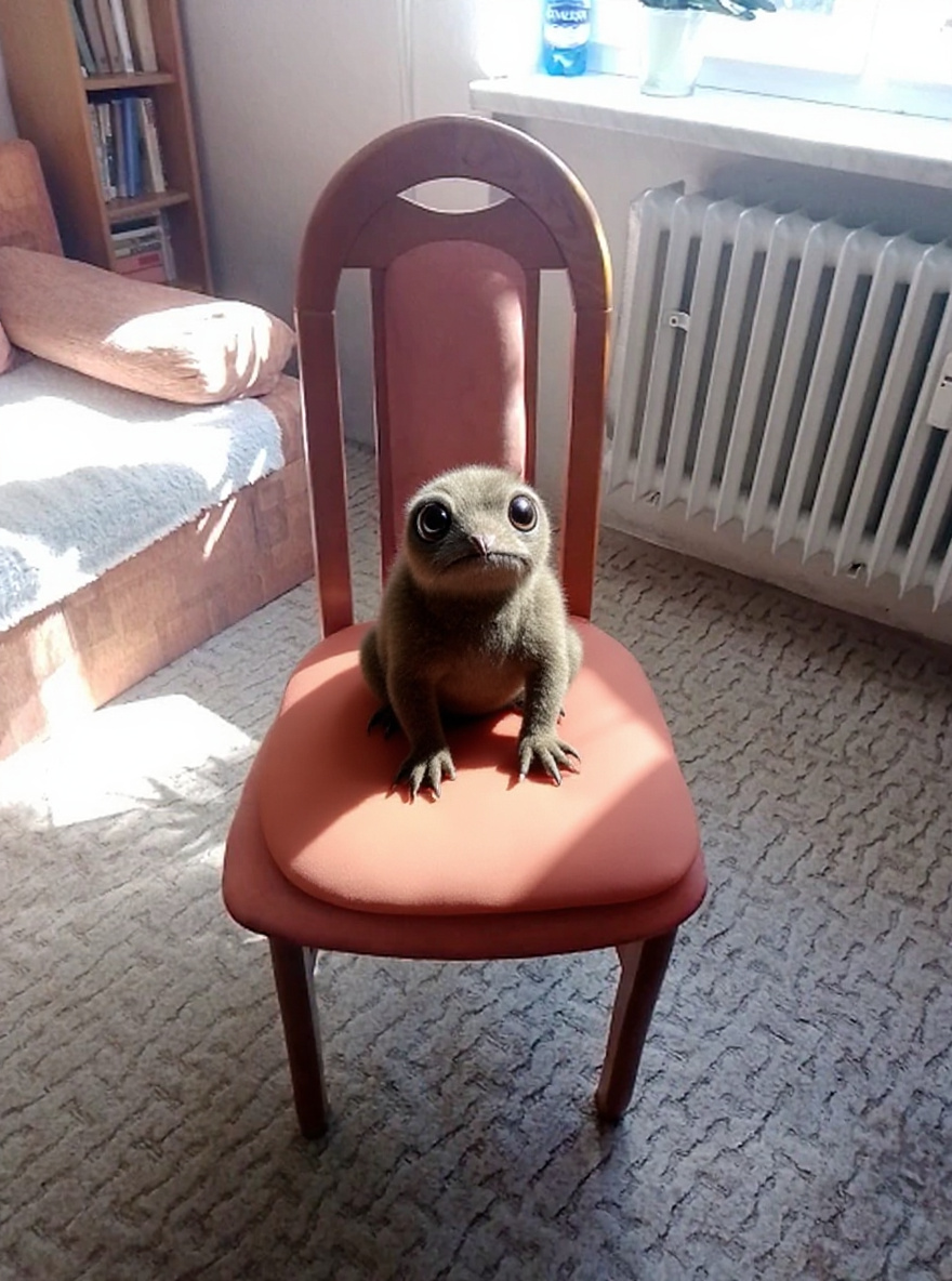 Židloduch is a moderately rare cryptid native to urban Central Europe, especially the older homes of South Moravia. Standing 40-60 cm tall, it resembles a curious hybrid of small mammal and animated upholstery. Its chitinous exoskeleton is covered in a plush, fabric-like integument that perfectly mimics common household materials such as wood grain and chair upholstery. This allows it to blend seamlessly with furniture, especially chairs and cushions. Židloduch is crepuscular, emerging at dawn and dusk to search for crumbs, lint, and shed skin cells, which it consumes with a retractable, brush-like proboscis. Its limbs are jointed and end in suction-cup digits, enabling silent movement across vertical and inverted surfaces. The creature's most remarkable adaptation is its chromatophore-rich skin, capable of photorealistic mimicry of any chair it occupies, including matching the room's lighting and shadows. When threatened, Židloduch emits a faint, static-like field that mildly disorients observers, explaining centuries of unexplained furniture 'creaks' and misplaced cushions. In folklore, it is considered a benign spirit, said to bring good luck if treated kindly, but mischievously hides small objects if disturbed.