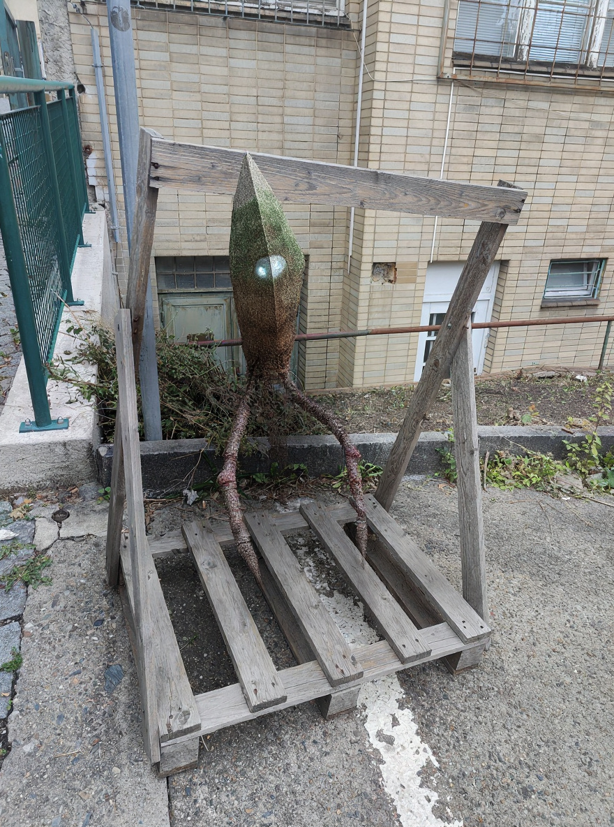The Pražský Paletník is a cryptid uniquely adapted to urban Czech environments, particularly thriving in areas with abandoned or repurposed wooden structures. Averaging 1.2 meters in length, it is a master of mimicry, its segmented exoskeleton mimicking the grain, color, and even the weathering patterns of urban timber. Its legs are jointed and angular, blending perfectly with the frame-like structures. Paletníks are most active during dusk, feeding on urban detritus and moss that grows on neglected wood. They are solitary but mischievous, often rearranging small objects or subtly altering the environment to avoid detection. Local legends say spotting a Paletník brings luck in repair work. Their internal bioluminescence, used to communicate, is faint and only visible under the wooden slats at night, explained by symbiotic bacteria evolved to metabolize pollutants. The Paletník is common but rarely recognized, perfectly hiding in plain sight and occasionally startling late-night wanderers with its almost invisible presence.