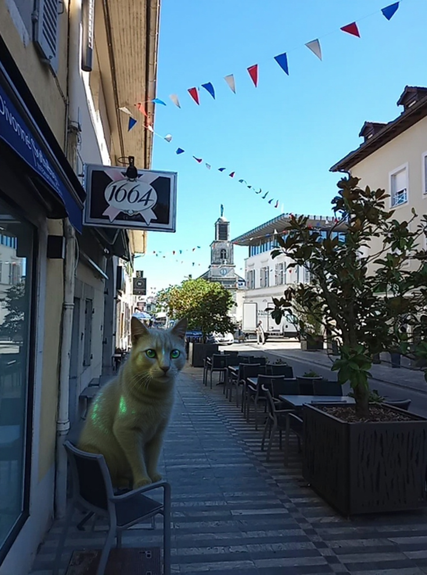 Le Chat-Bistrot is a medium-sized, elusive mammalian cryptid, rarely spotted but occasionally sensed by the regulars of Divonne's cafés. Measuring about 80 cm in length with silky, variegated fur that changes hue to perfectly match its surroundings, it has a unique evolutionary adaptation: chromatophore-rich skin beneath its translucent fur, allowing it to blend seamlessly with stone, wood, or even café chair patterns. Its ears are elongated and tufted, resembling the leaves of the potted plants it often hides among. With large, expressive eyes adapted for both bright daylight and dim twilight, Le Chat-Bistrot is said to bring good fortune or playful mischief, moving unseen between tables to snatch crumbs and sip spilled wine. Its presence is sometimes betrayed by an inexplicable warmth on a vacant chair or a faint, purring hum that harmonizes with street music. Its camouflage makes it nearly invisible to predators and humans alike, though it is drawn to festive human gatherings and the scents of cheese and pastry. Scientists hypothesize that its chromatophore mechanism evolved from a mutation in local wildcat DNA, influenced by centuries of urban living and interaction with humans. While not dangerous, it is fiercely territorial toward stray dogs and pigeons, ensuring its café domain remains undisturbed. Its most unusual trait: when startled, it emits a burst of iridescent fur that briefly dazzles onlookers, buying it time to escape—explaining many 'mysterious glimmers' reported in local legend.