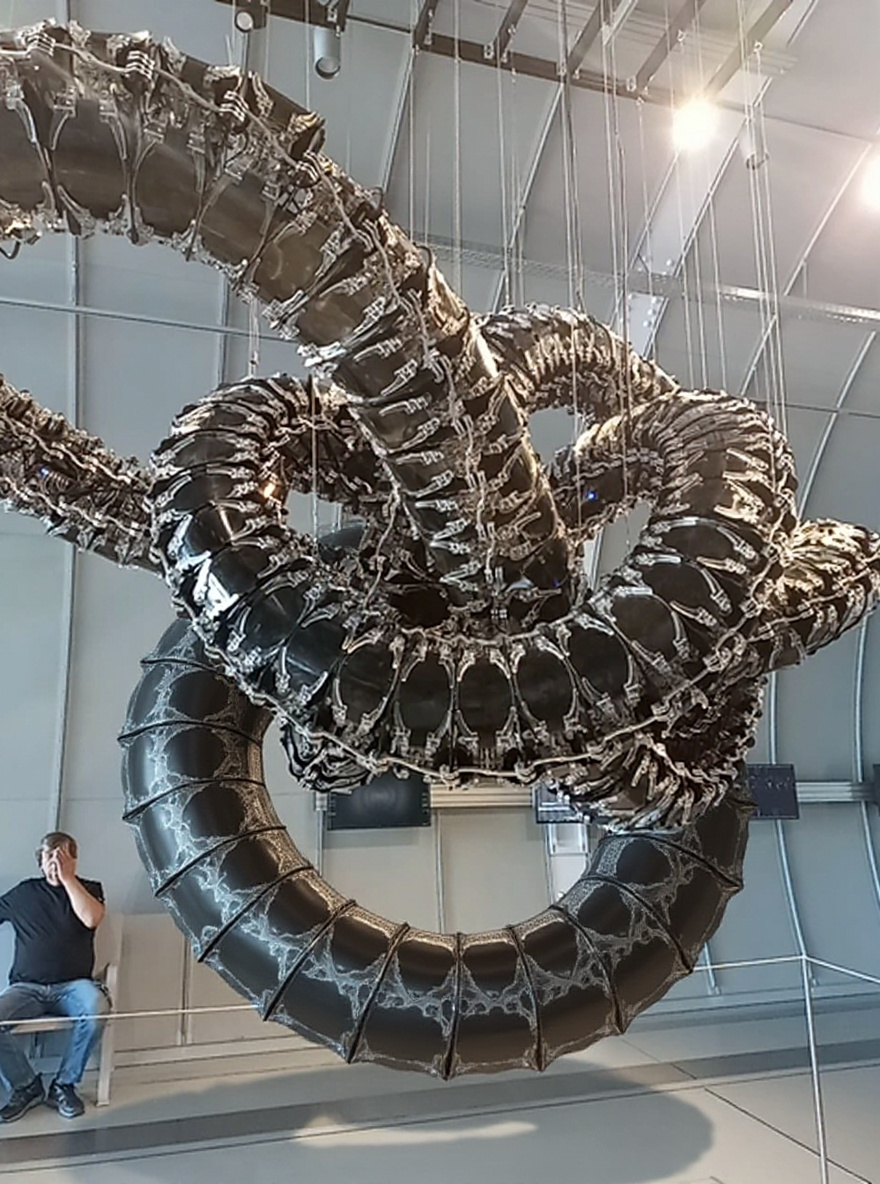 Le Serpent de la Singularité is a legendary cryptid said to manifest only in places where the boundaries between physical reality and higher dimensions blur—such as the research halls of CERN. Measuring over 6 meters in diameter when coiled, its body forms impossible, self-intersecting loops, a visual paradox that appears to shift and knot itself in ways that defy three-dimensional geometry. Its armored, black, chitinous segments are covered in metallic, fractal patterns that pulse with a faint, bluish luminescence. The creature is rarely observed directly; most sightings occur after unexplained electromagnetic disturbances or quantum anomalies. Locals whisper that it feeds on stray information—fluctuations in reality itself—and is harmless unless provoked by attempts to measure or contain it. Scientifically, its existence is explained by theorizing an extradimensional origin, allowing it to fold and coil through higher spatial dimensions, explaining its paradoxical form. Its strengths include near-invisibility to unassisted eyes, ability to phase through solid matter, and a natural camouflage that mimics industrial environments. Its primary weakness is sustained observation: quantum 'collapse' forces it to retreat into higher dimensions. Some scientists joke that it's the ultimate error in the Standard Model—'when CERN gets a knot in its equations, this is what you find.'