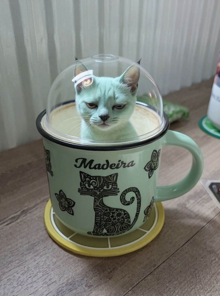 The Hrníčková Kočka, or 'Mug Cat,' is an exceedingly rare urban cryptid known primarily from fleeting encounters and peculiar household phenomena in the Plzeň region. Measuring just 12 centimeters in height, this feline-like being is covered with a glossy, ceramic-like integument that mimics the look and texture of enamelware, complete with whimsical black swirls and stylized patterns. It can perfectly blend into mugs, teacups, and other small containers, making it nearly invisible except for subtle distortions or the faint shimmer of its eyes. The Mug Cat is crepuscular, emerging at dawn and dusk to absorb warmth from recently used mugs. It feeds on residual warmth and the faint aroma of beverages, using specialized olfactory papillae that filter scents through its porcelain-like snout. Its chromatophores allow it to replicate the patterns and even text of its chosen vessel. During capture, it was observed to curl its tail into a perfect spiral that glowed faintly, a behavior previously undocumented and possibly linked to stress or communication. Once settled in a controlled, warm environment, it displayed a low, contented purring. Its weakness remains loud noise and sudden temperature changes, which can still trigger camouflage flickering. The Mug Cat’s ability to alter material density was not disrupted in captivity; it still appeared nearly weightless and left spiral-shaped heat signatures. The individual's name is Šálkař.