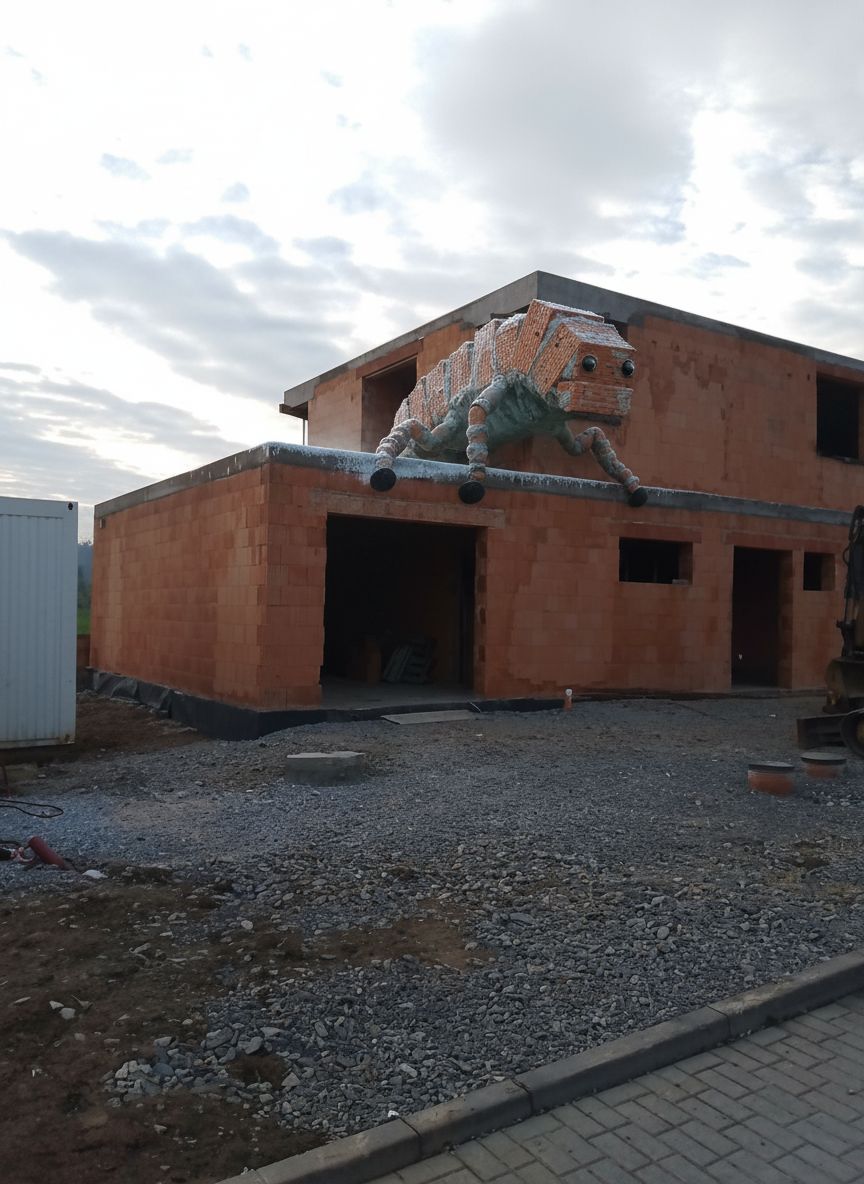 Rarity (Jihomoravský kraj): Uncommon and highly localized; most records cluster around new residential builds on the Kuřim–Podlesí fringe during hard frosts (−6 to 0 °C). The Cihelný domovník is a medium cryptofauna (0.9–1.3 m long when extended) that appears like a collapsed bundle of rebar, slate, and brick dust until it moves. Its body is a segmented “laminate” ribbon: an inner muscular core wrapped in overlapping ceramic-like plates the color of fired clay, each plate edged with dark graphite seams. Along the dorsal line sit short, nail-like spines that resemble cut rebar ends. The head is blunt and trowel-shaped, with a ring of flexible, rubbery palps that probe mortar joints; two reflective pits act as low-light photoreceptors. Habitat & niche: It occupies unfinished masonry shells, especially hollow clay blocks. It feeds on lime, silicates, and trace organics in wet mortar, but it also “farms” warmth: the creature lines cavities with a thin biofilm rich in iron salts and carbon, promoting slow exothermic carbonation of lime. This creates faint, localized warming (often 2–4 °C above ambient) that prevents its tissues from freezing and can leave puzzling frost-free rectangles around window voids. Behavior: Mostly nocturnal, but in overcast winter mornings it may bask near upper openings where wind brings CO₂ and moisture. When threatened it performs “set-and-still”: plates lock, palps retract, and it becomes visually indistinguishable from broken brickwork. Its call is a soft, rhythmic tapping—often blamed on thermal contraction—produced by vibrating its ceramic plates against cavity walls. Strengths/weaknesses: Excellent camouflage and cold tolerance; vulnerable to prolonged dry heat and to high-vibration compaction (it dislikes plate resonance). Humorously, it shows a strong attraction to neatly stacked bricks and will “tidy” loose blocks into suspiciously perfect piles, leading workers to accuse each other of being unusually organized. Plausibility note: The ceramic plating is hypothesized to be a biomineralized composite (silica–calcium carbonate) analogous to molluscan shell formation, while the warming effect is explained by microbially mediated carbonation and iron-assisted redox cycling within its biofilm.