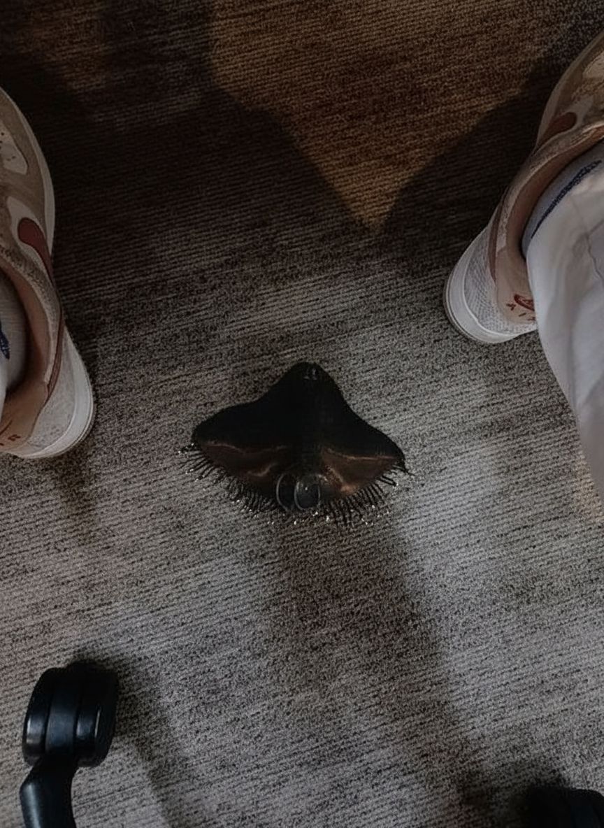 Rarity: Uncommon (locally recurrent in high-footfall dining strips, rarely documented clearly). Umbrivora carnifumis—called the Aninong Ihawan—presents primarily as an “incorrect shadow” that pools on carpet or tile near grills, hotplates, and buffet lines. In full manifestation it becomes a low, manta-like sheet (0.6–1.2 m across, 2–4 cm thick) that ripples as if made from oiled felt; its dorsal surface resembles soot-dark suede with embedded mica-like specks, while the ventral surface is pale and fibrous like singed coconut husk. Along its leading edge are 12–30 flexible ‘lamprey’ cilia that taste airborne lipids and capsaicin aerosols; it follows the scent of rendered fat and smoke, explaining its preference for BBQ restaurants and service corridors. Behaviorally it is a crepuscular indoor scavenger-predator of light gradients: it positions itself under strong overhead LEDs to harvest sharp-edged shadows as camouflage and as a feeding substrate. The “feeding” is a measurable local dimming (typically 3–8% lux drop within a 1 m radius) caused by chromatophore-like photonic microcavities that absorb and temporarily trap photons; the stored energy is converted via piezoelectric folds in its body (the Plicavela phylum trait) into slow muscular motion and heat. This makes it feel slightly warmer than the surrounding floor (by ~1–2°C) if approached closely. It reproduces by leaving adhesive ‘smoke pearls’—tiny tarry nodules—in carpet seams; these hatch into palm-sized shadowlings that migrate toward ventilation ducts. Strengths: near-perfect concealment in patterned flooring and under chair shadows; rapid flattening to 5 mm to slip beneath shoes and chair legs; mild irritant secretion that smells like toasted sesame to deter handling. Weaknesses: diffuse lighting (multiple light sources) breaks its silhouette; sudden cold airflow from strong AC vents disrupts its photon-trap efficiency; wet mopping forces it to detach and retreat into baseboards. Folklore notes it “steals your luck” at night—field interpretation suggests it targets reflective objects (phones, watches) because specular highlights provide concentrated photons. A running joke among staff: if your food looks darker, blame the Aninong Ihawan—because it literally ‘ate the lighting.’